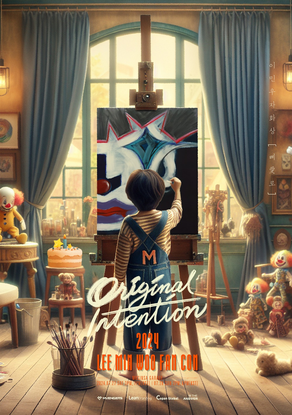 이민우가 현재 다양한 작품을 선보이며 연예계 대표 아트테이너로 활약 중인 가운데, 이번 팬 콘서트 포스터에도 그의 정체성이 담겨 있어 기대와 궁금증이 더욱 커지고 있다. '이민우 자화상 삐愛로'라는 부제가 호기심을 자극하며, 이민우 솔로 활동 명인 'M'이라는 알파벳이 새겨진 옷을 입고 삐에로 그림을 그리고 있는 어린 소년의 뒷모습 역시 시선을 사로잡는다. 포스터 속 그림은 이민우가 직접 그린 것으로, 그의 예술성을 다시 한번 확인케 한다.