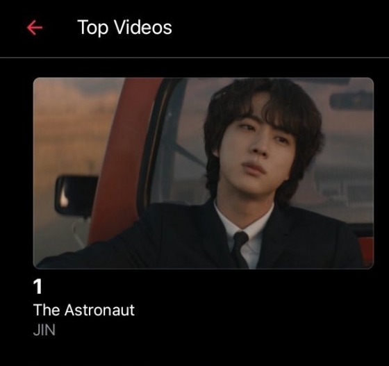 지난 2022년 10월 28일 발매된 진의 첫 솔로 싱글 '디 애스트로넛'은 6월 28일 애플뮤직(Apple Music) 트리니다드 토바고(Trinidad & Tobago) 톱200 뮤직비디오(Top200 Music Videos) 차트에서 1위를 차지했다.