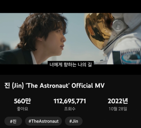 지난해 12월 4일 진의 생일에 1억 뷰를 달성한 '디 애스트로넛' 뮤직비디오는 6월 29일 오전 6시 기준 1억 1269만 뷰를 넘어섰다.