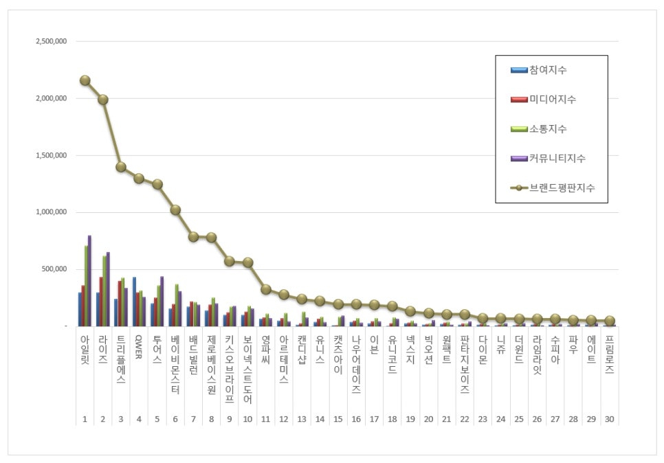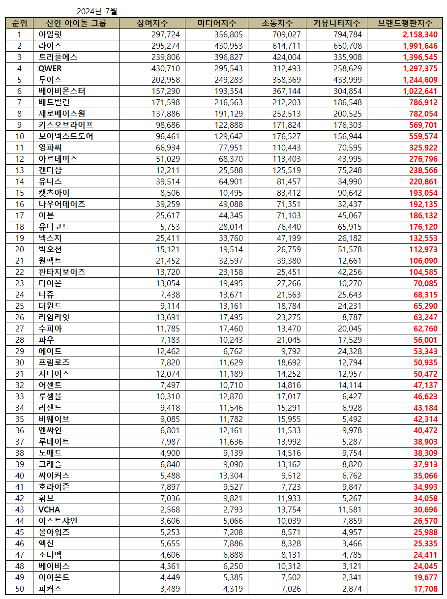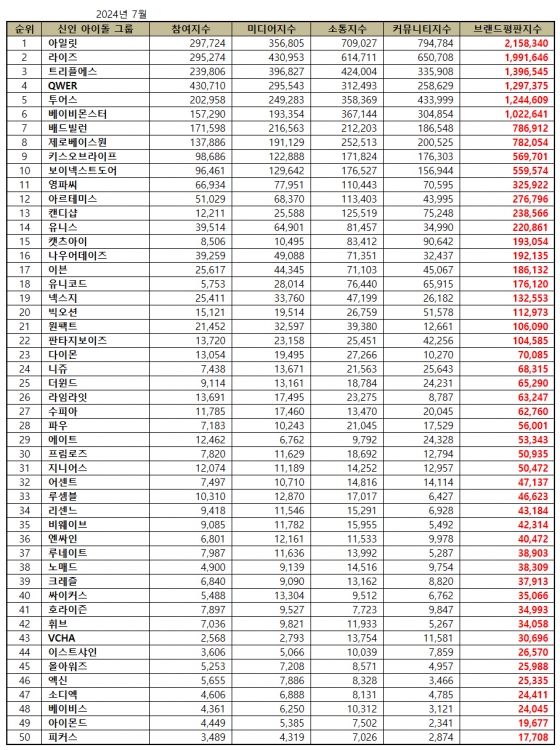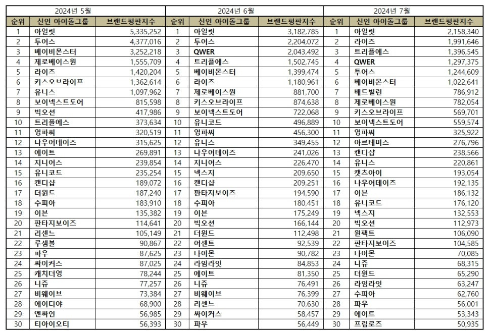 2024년 7월 신인 아이돌그룹 브랜드평판 30위 순위는 아일릿, 라이즈, 트리플에스, QWER, 투어스, 베이비몬스터, 배드빌런, 제로베이스원, 키스오브라이프, 보이넥스트도어, 영파씨, 아르테미스, 캔디샵, 유니스, 캣츠아이, 나우어데이즈, 이븐, 유니코드, 넥스지, 빅오션, 원팩트, 판타지보이즈, 다이몬, 니쥬, 더윈드, 라임라잇, 수피아, 파우, 에이트, 프림로즈 순으로 분석됐다.