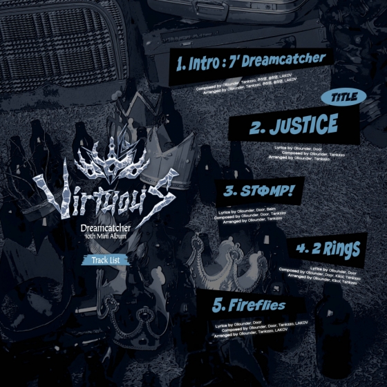 공개된 트랙리스트에 따르면 이번 'VirtuouS'에는 타이틀 'JUSTICE(저스티스)'부터 'Intro : 7' Dreamcatcher(인트로 : 7' 드림캐쳐)', 'STΦMP!(스톰프!)', '2 Rings(2 링스)', 'Fireflies(파이어플라이스)'까지 총 다섯 개의 트랙이 담긴다.