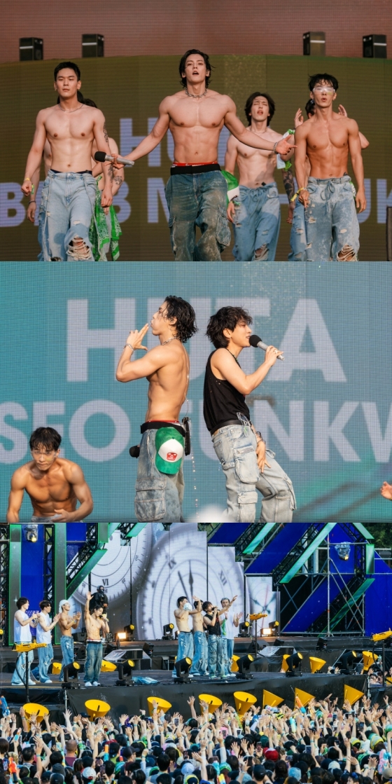 특히 이민혁은 깜짝 게스트로 무대에 등장한 서은광과 함께 아직 발매되지 않은 미공개곡을 비롯해 비투비의 메가 히트곡 '너 없인 안 된다'와 '그리워하다'까지 메들리로 선보여 관객들을 더욱 열광하게 만들었다. 두 사람은 쏟아지는 물줄기 속에서도 완벽한 라이브를 선보이며 데뷔 13년 차 '장수 그룹'다운 찰떡 호흡을 자랑해 관객들의 폭발적인 호응을 이끌어냈다.