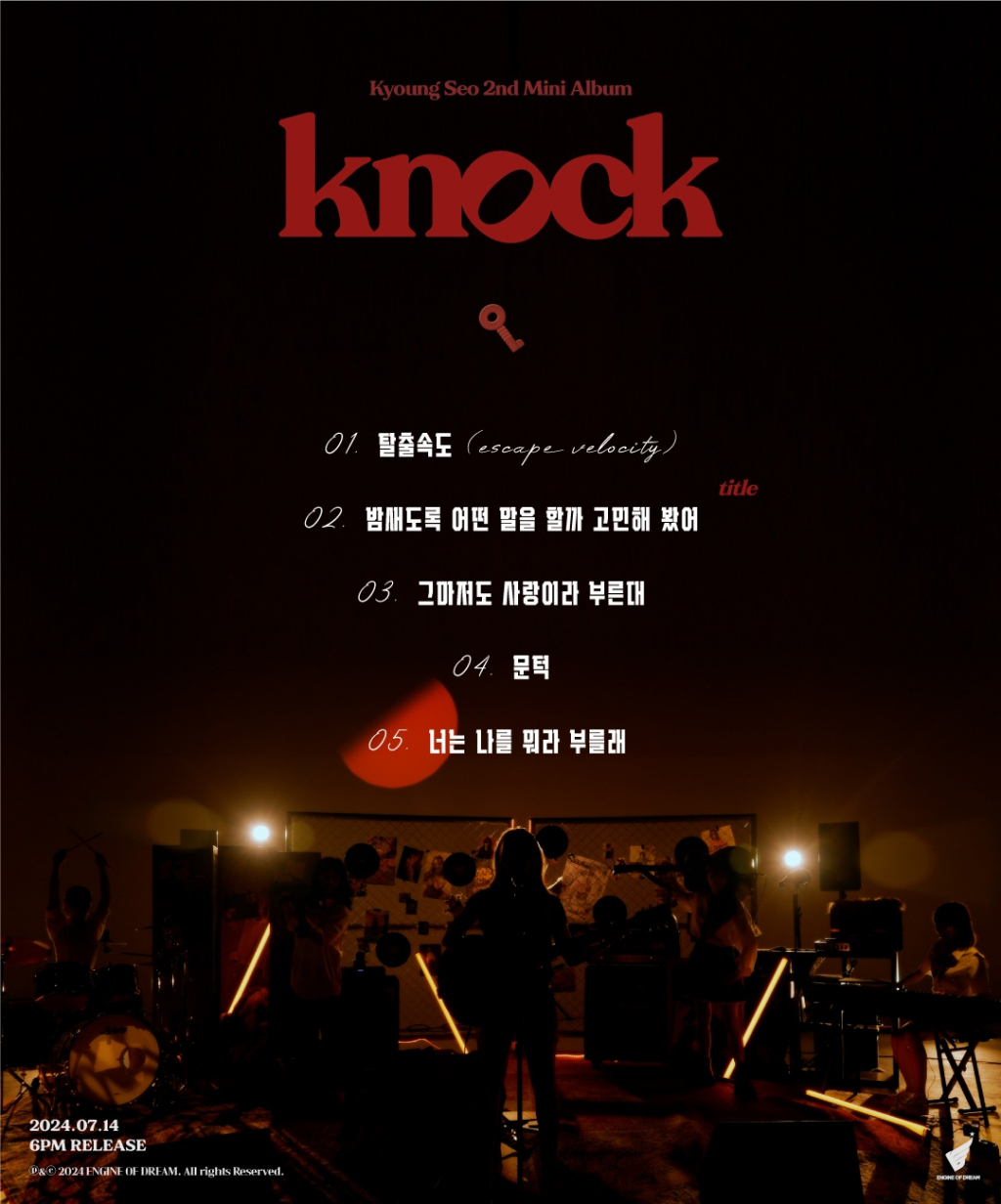 인상적인 곡명과 함께 이미지 속 빨간색 폰트로 적힌 앨범명과 그 아래 자리한 열쇠, 기타를 든 경서와 밴드 연주자들의 실루엣이 'Knock'를 향한 궁금증을 높인다.