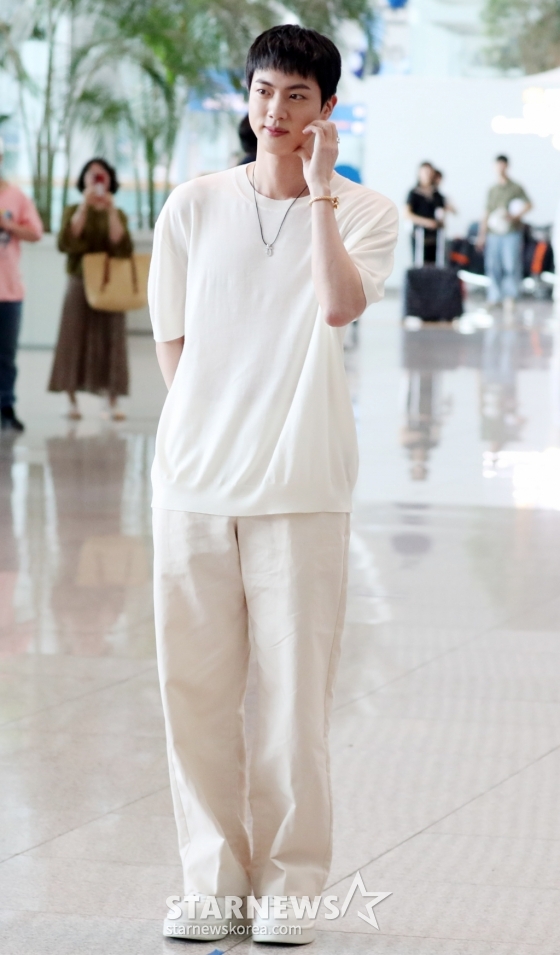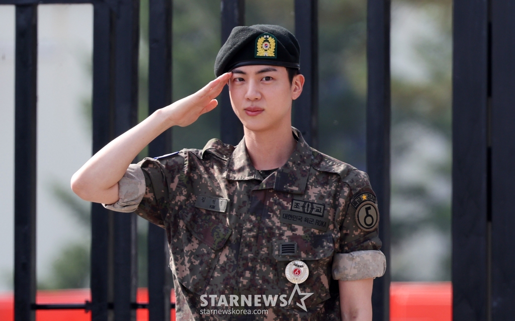 앞서 진은 지난달 12일 경기도 연천군에 위치한 제5보병사단에서 육군 병장 만기 전역했다. 그룹 내 첫 군필자로 진은 전역 바로 다음 날인 13일 서울 송파구 일대에서 펼쳐진 오프라인 행사 '2024 FESTA'에 참석했다. 'FESTA'는 매년 데뷔일을 기념해 방탄소년단과 팬들이 함께 즐기는 축제다.