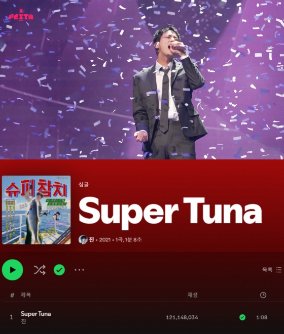 진의 '슈퍼참치'는 세계 최대 음원 플랫폼 스포티파이(Spotify)에서도 눈부신 기록을 달성하며 7월 14일 오후 10시 기준 1억 2114만 스트리밍을 넘어섰다. 방탄소년단 유튜브 채널 'BANGTANTV'에 공개된 '슈퍼참치' 스페셜 퍼포먼스 비디오는 9816만 뷰를 기록, 1억뷰 고지를 향해 순항 중이며, 2절 팬미팅 영상과 함께 큰 사랑을 받으며 글로벌 인기를 이어가고 있다.