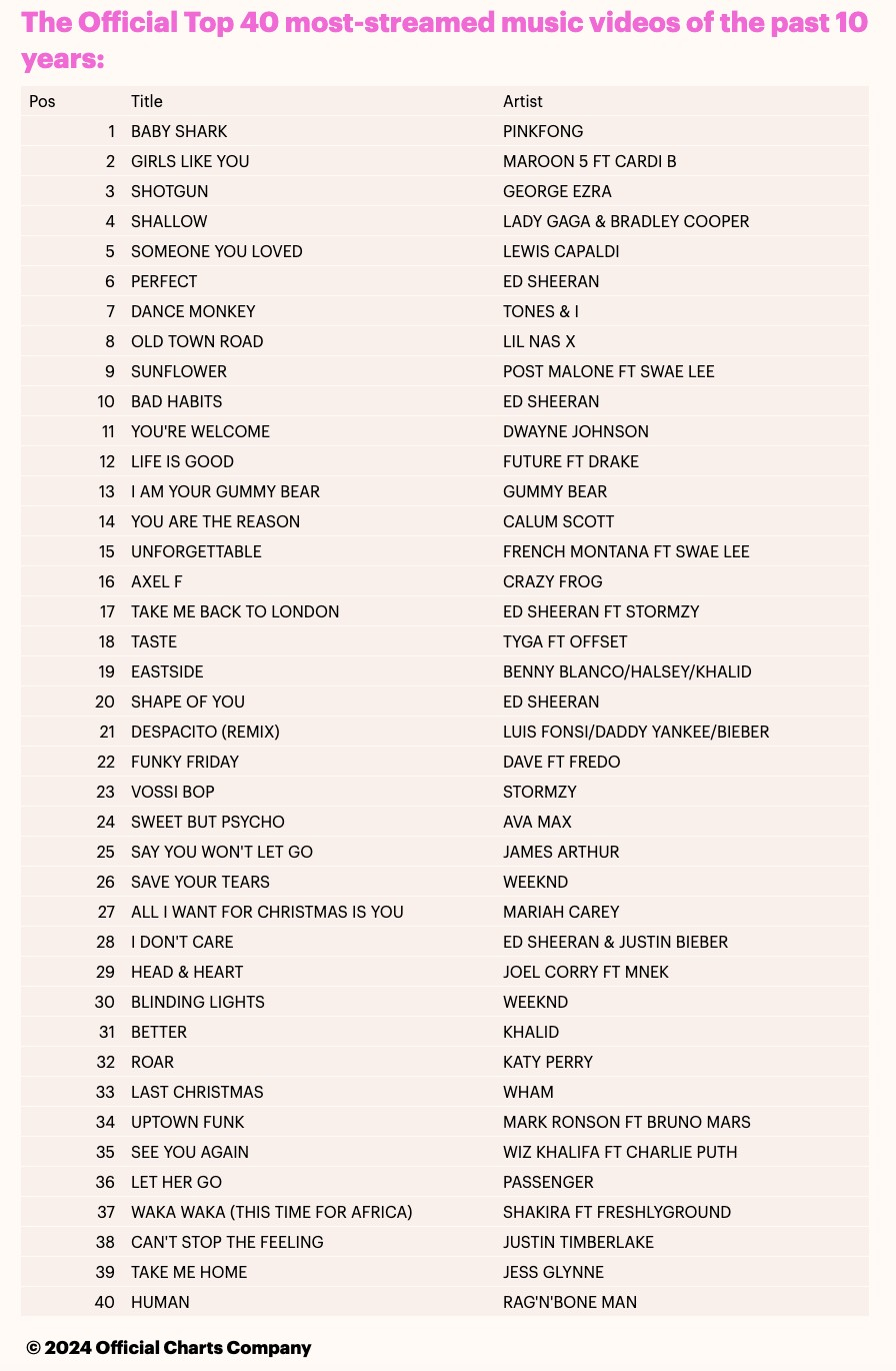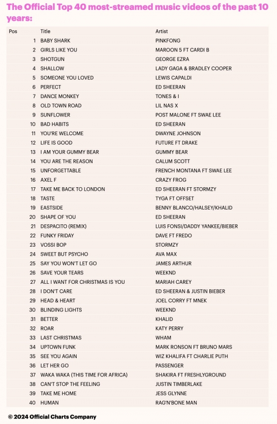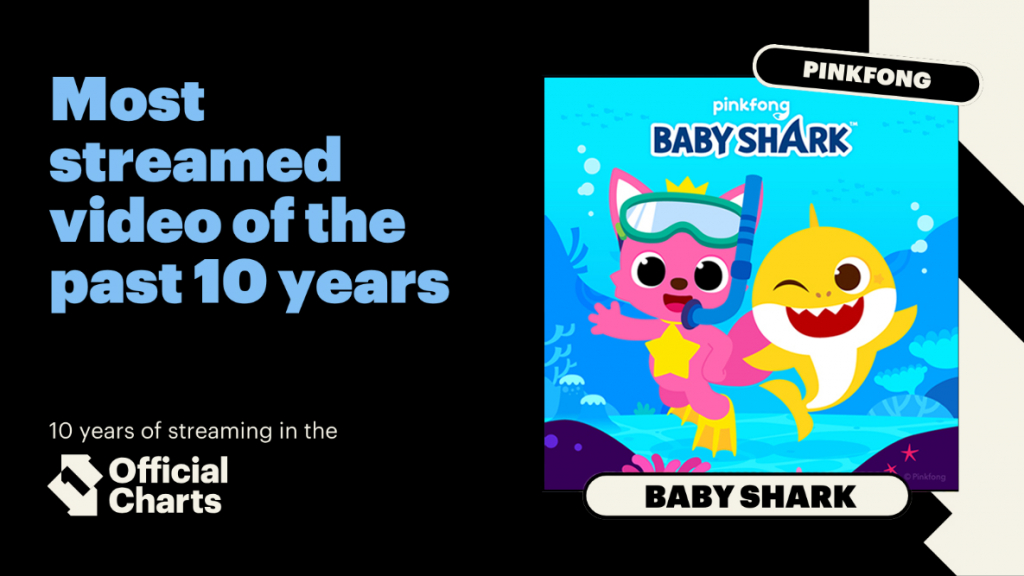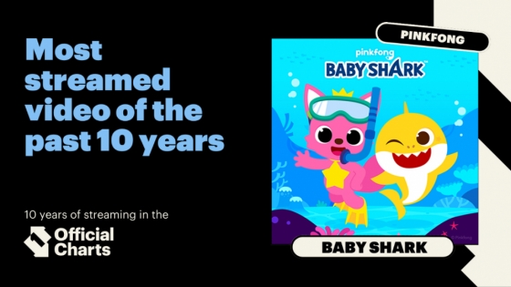 빌보드와 함께 세계 양대 음악 차트로 꼽히는 영국 오피셜 차트는 2014년 스트리밍 데이터를 차트에 반영한 이후 올해 10주년을 맞아 스트리밍 시대에 최고의 인기를 누리고 있는 음악 순위를 발표했다. 17일(현지 시각) 영국 오피셜 차트의 발표에 따르면, '핑크퐁 아기상어'는 영국에서만 2억 7196만건이 넘는 스트리밍 횟수를 기록, 가장 많이 스트리밍된 뮤직비디오(MV) 1위에 등극했다.