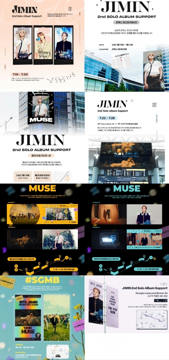 한국의 지민 팬베이스 '올포지민'(ALLFORJIMIN_KOR)은 지민의 두번째 솔로앨범 '뮤즈' 발매를 홍보하기 위해 7월 19일 오전 6시부터 자정까지 홍대 미래프라자와 더불어 강남 지역의 규정빌딩과 우신빌딩 옥외 전광판 광고를 진행한다.