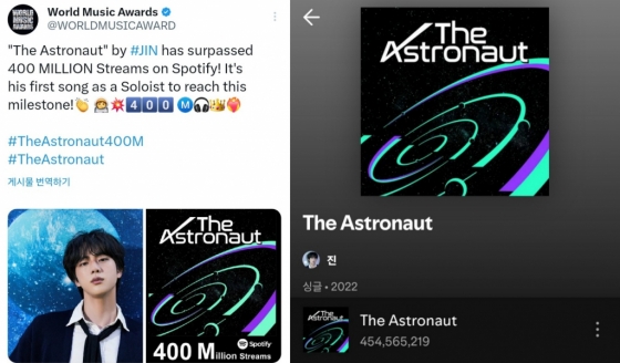 월드 뮤직 어워드'(World Music Award/WMA)는 공식 계정을 통해 "진의 'The Astronaut'이 스포티파이에서 4억 스트리밍을 돌파했다. 솔로 가수로서의 진에게 디 애스트로넛의 4억 달성은 중대한 이정표에 도달한 것이다"라고 축하하며 그 의미를 더했다.