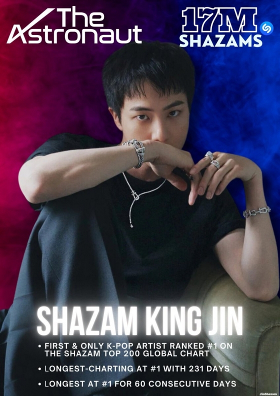 진의 '디 애스트로넛'은 세계 최대 음원 검색 플랫폼 샤잠(Shazam)에서도 눈부신 기록을 달성했다.