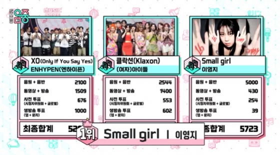 20일 오후 방송된 MBC 음악 프로그램 '쇼! 음악중심'(이하 '음중')에서는 이영지가 1위를 차지했다. 이날 7월 3주차 1위 후보로 엔하이픈 'XO (Only If You Say Yes)', (여자)아이들 'Klaxon'(클락션), 이영지 'Small Girl'(스몰 걸)이 올랐다.