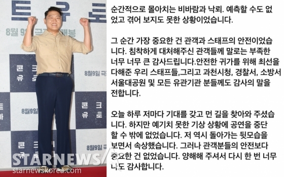 이와 관련해 싸이는 개인 SNS에 "순간적으로 몰아치는 비바람과 낙뢰. 예측 할 수도 없었고 겪어 보지도 못한 상황이었다. 그 순간 가장 중요한 건 관객과 스태프의 안전이었습니다. 침착하게 대처해주신 관객들께 말로는 부족한 너무 너무 큰 감사드린다"라며 장문의 글을 게재했다.