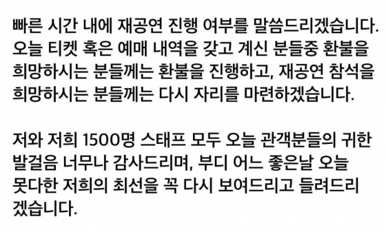 빠른 시간 내에 재공연 진행 여부를 말씀드리겠습니다. 오늘 티켓 혹은 예매 내역을 갖고 계신 분들 중 환불을 희망하시는 분들께는 환불을 진행하고, 재공연 참석을 희망하시는 분들께는 다시 자리를 마련하겠습니다.