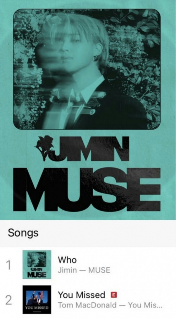 지민이 7월 19일 오후 1시에 발표한 신보 '뮤즈(MUSE)'의 타이틀 '후'는 현재 미국과 영국을 포함, 전 세계 아이튠즈 톱송 차트에서 116개 국가 및 지역 1위를 차지하며 인기 순항중에 있다.