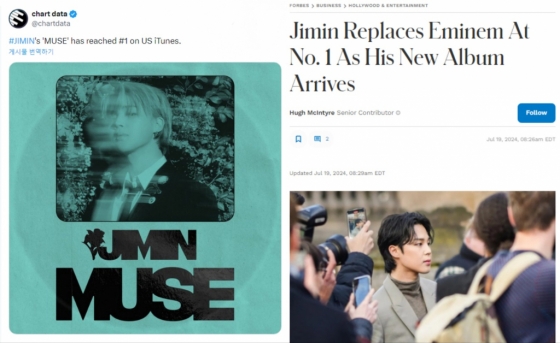 '포브스(Forbes)'는 ''지민의 새 앨범이 도착하자 에미넴(Eminem)의 No.1 자리 차지''라는 제목 아래 "몇 주 동안 기다리던 지민의 '뮤즈'가 등장하자 전 세계 팬들이 빠르게 지지했고 특히 미국에서 그 사랑이 뚜렷하게 드러났다"고 전하는 등 지민은 이렇듯 세계 최대 음악시장인 미국을 휘감는 돌풍의 주역으로 많은 화제를 모으고 있다.
