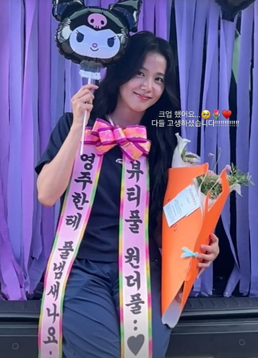 사진 속에서 지수는 벤 트렁크에 걸터 앉아 축하를 받고 있다. 특히 지수의 목에는 "영주한테 풀냄새나요. 뷰티풀 원더풀"이라는 문구가 새겨진 띠지가 둘러져 있어 지수가 현장 스태프들에게 많은 사랑을 받으며 촬영을 진행했다는 것을 알 수 있다.