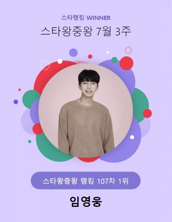 임영웅은 지난 19일 오후 3시 1분부터 26일 오후 3시까지 진행된 7월 3주(107차) 스타왕중왕 랭킹 투표에서 16만 3962표를 차지하며 1위 자리를 수성했다. 이로써 임영웅은 107주 연속 왕좌를 지켜냈다.
