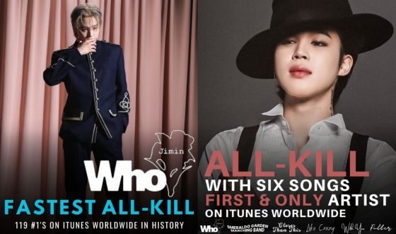 지난 24일 지민의 두번째 솔로 앨범 '뮤즈(MUSE)'의 타이틀 곡 '후(Who)'가 슬로베니아 아이튠즈 '톱 송' 차트 1위에 등극했다. 이로써 '후'는 전 세계 119개 국가 및 지역 아이튠즈 '톱 송' 차트 1위에 올라 발매 5일 10시간 20여분 만에 역대 최단시간 올킬의 경이적인 신기록을 세웠다.
