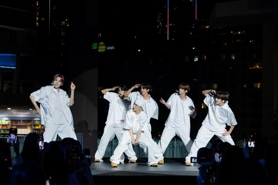 해가 지고 시작된 공연에서 투어스는 '첫 만남은 계획대로 되지 않아'를 시작으로 '더블 테이크(Double take)', '오마이마이: 7s(Oh Mymy : 7s)', '비에프에프(BFF)', '헤이! 헤이!(hey! hey!)', '내가 S면 넌 나의 N이 되어줘' 등 6곡의 퍼포먼스를 선보였다. 루프탑을 가득 메운 팬들은 퍼포먼스에 맞춰 어깨를 들썩거리고 연신 환호하며 LA의 뜨거운 밤을 즐겼다. 아울러 이날 투어스의 공연에는 그래미 뮤지엄 CEO 마이클 스티카(Michael Sticka)를 비롯해 유력 매체 취재진이 현장을 대거 찾았다.