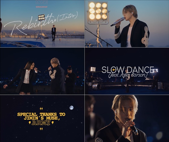 지민은 4일 오후 1시 방탄소년단 공식 유튜브 채널을 통해 솔로 2집 'MUSE'의 수록곡 'Rebirth (Intro)', 'Slow Dance (feat. Sofia Carson)'의 라이브 클립을 공개했다. 이번 영상은 서울 시내의 한 고층 건물 옥상에서 촬영됐다. 지민은 두 곡이 갖고 있는 청량하면서도 로맨틱한 느낌을 살리기 위해 탁 트인 전경과 하늘을 한눈에 감상할 수 있는 야외에서 라이브 밴드와 함께 공연을 펼쳤다.
