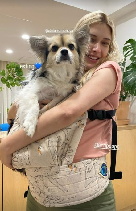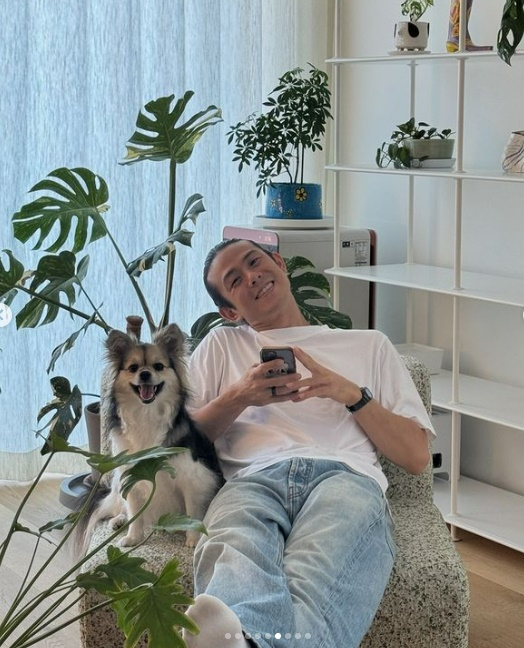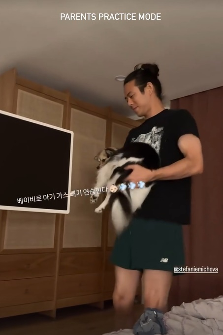 빈지노와 미초바는 반려견을 안고 육아 연습을 하기도. 미초바는 반려견을 든 빈지노의 모습과 함께 "베이비로 아기 가스 빼기 연습한다"고 전해 웃음을 자아냈다.
