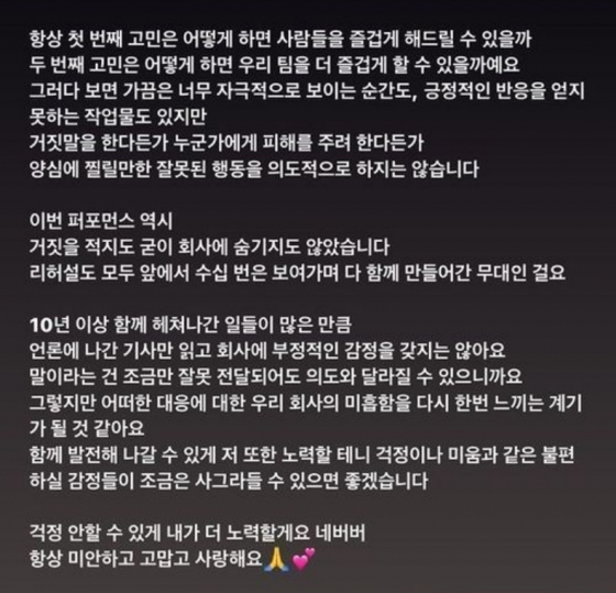 이어 전소연은 "이번 퍼포먼스 역시 거짓을 적지도, 굳이 회사에 숨기지도 않았습니다. 리허설도 모두 앞에서 수십 번은 보여가며 다함께 만들어간 무대인 걸요"라며 큐브의 주장을 반박했다.
