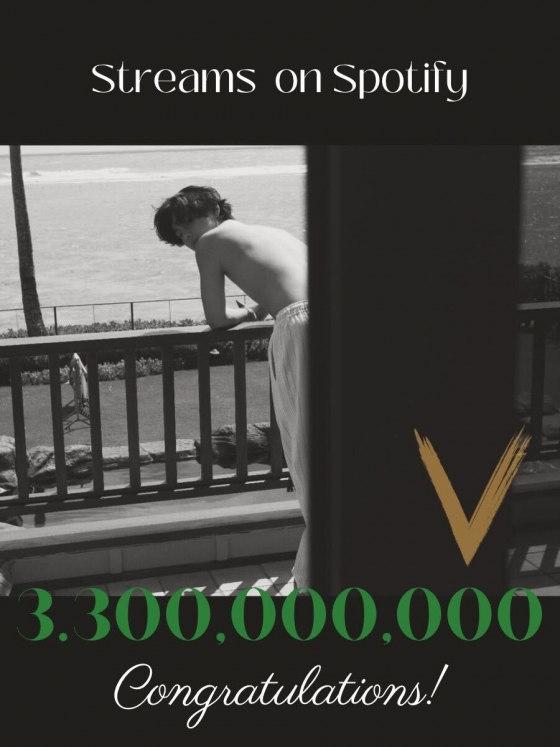 스포티파이에 따르면 뷔는 지난 7월 30일 스포티파이 크레딧 합산 총 33억 스트리밍을 넘어섰다.