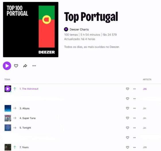 '디 애스트로넛'은 최근 '디저 포르투갈 톱100' 차트(Top 100 Portugal Deezer Chart)에서 1위를 차지했다.