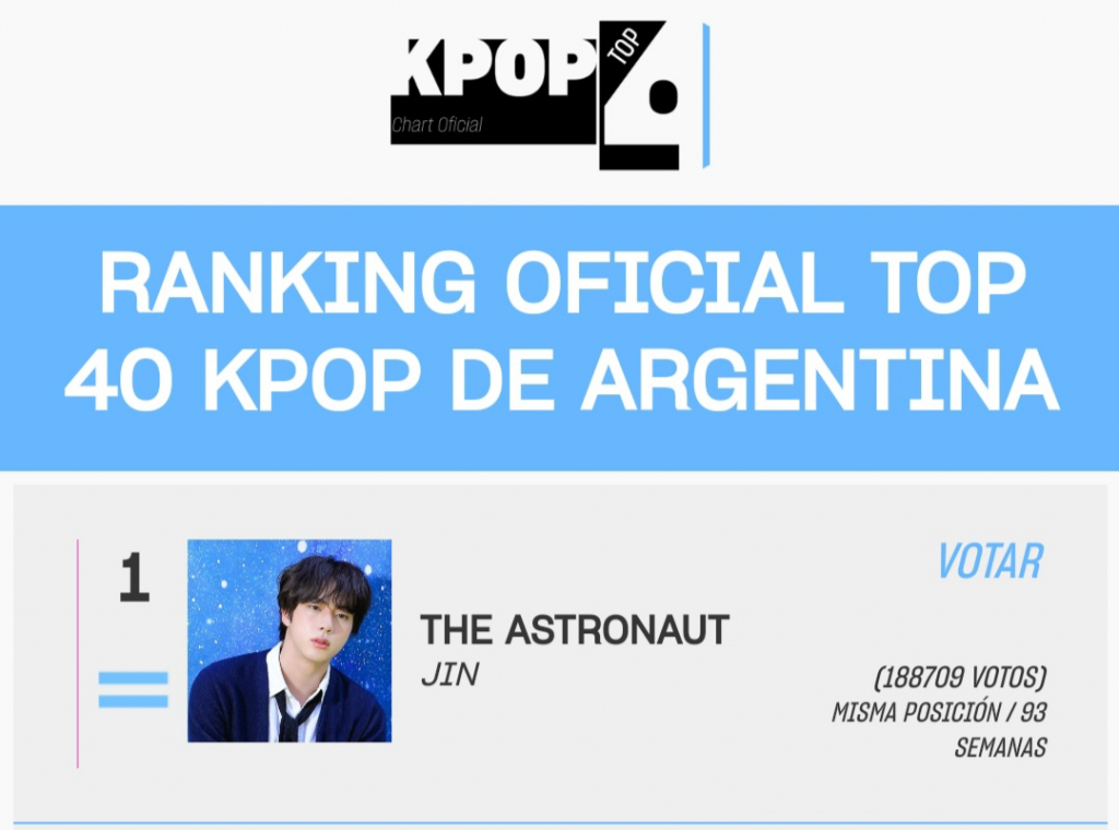 진의 첫 솔로 싱글 '디 애스트로넛'은 최근 아르헨티나(Argentine) 'Top 40 Kpop' 차트에서 18만 표가 넘는 압도적인 표수로 1위를 차지하며 93주 연속 1위를 달성했다.