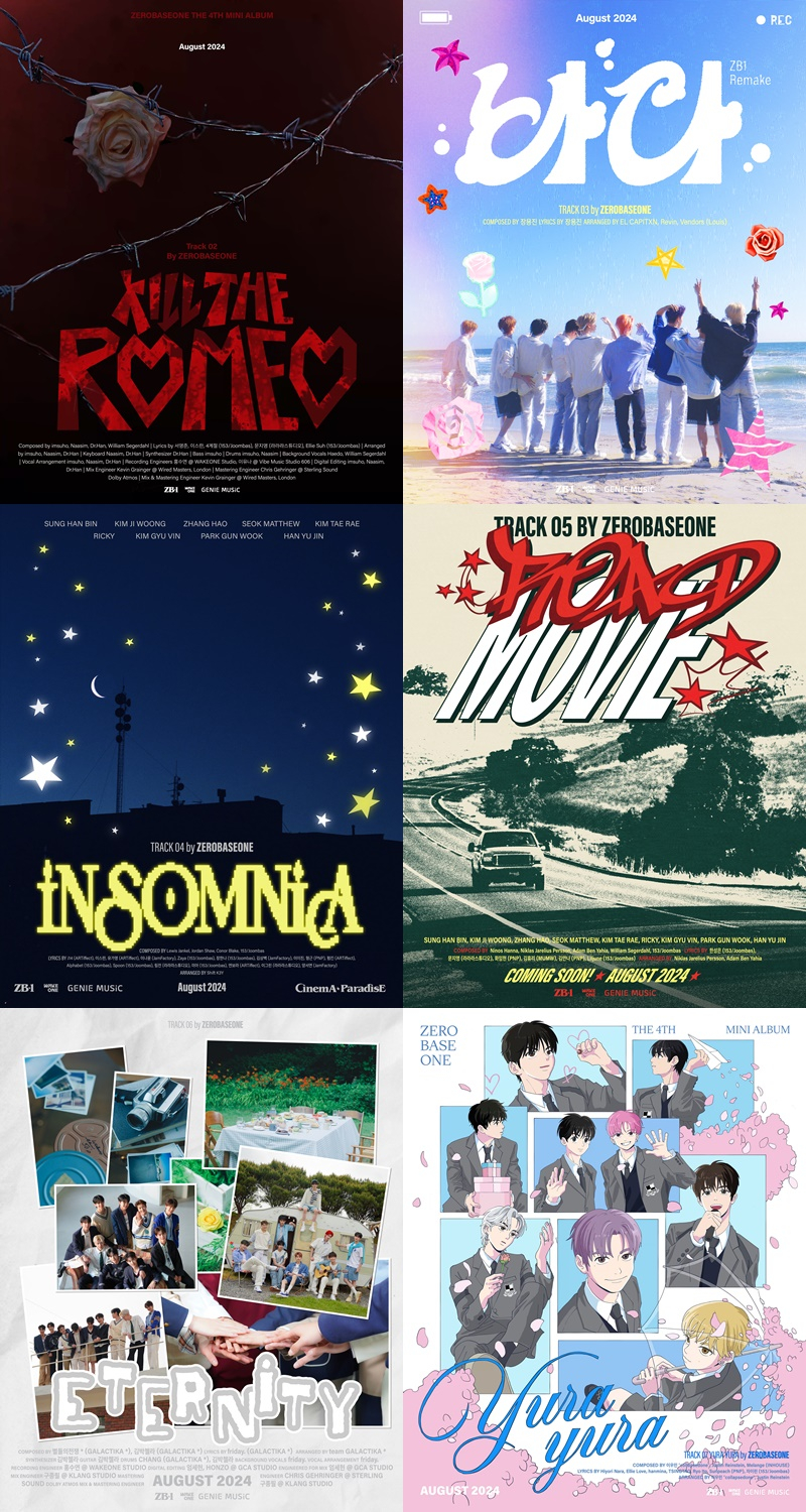 이어 8일에는 수록곡 'KILL THE ROMEO(킬 더 로미오)', 'YURA YURA (Korean Ver.)(유라유라 (Korean Ver.)', 'Insomnia(인썸니아)', 9일에는 '바다 (ZB1 Remake)', 'Eternity(이터니티)', 'Road Movie(로드 무비)' 트랙 포스터를 연이어 게재했다. 미니 4집 'CINEMA PARADISE'에 수록된 총 7개 트랙의 제목이 모두 베일을 벗은 가운데, 각 트랙 포스터는 실제 영화 포스터처럼 감각적으로 디자인됐다. 미스터리 스릴러, 판타지, 애니메이션 등 다양한 영화 장르가 등장한 것에서 짐작할 수 있듯, ZEROBASEONE은 다채로운 음악 장르로 국내외 팬들과 만날 전망이다.
