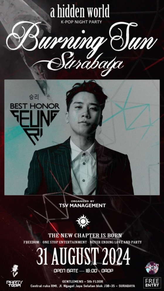 충격적인 사실은 해당 행사의 특별 게스트로 승리가 나선다는 것. TSV 매니지먼트는 공식 SNS에 승리의 사진이 담긴 '버닝썬 수라바야' 포스터를 게재, 승리의 출연을 공식화했다.