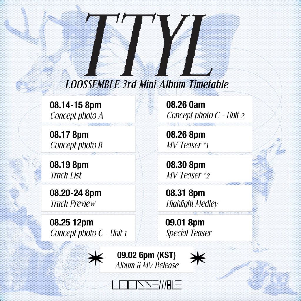 새롭게 베일을 벗은 타임 테이블 이미지에 따르면 루셈블은 오는 9월 2일 오후 6시 'TTYL'을 발매하고 본격적인 컴백 활동에 나설 예정. 이에 앞서 팬들을 위한 다양한 티징 콘텐츠가 준비돼 눈길을 끈다.