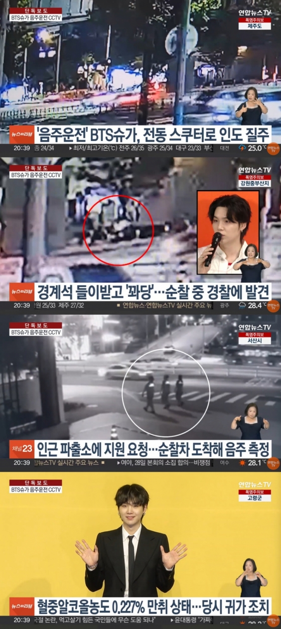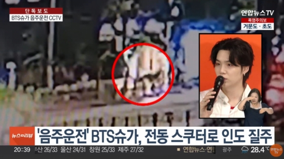 13일 연합뉴스TV는 '만취 상태로 인도 달린 BTS 슈가…CCTV에 담긴 사고 순간'이라는 단독 보도를 통해 슈가의 음주 운전 사고 당시 CCTV를 공개했다.
