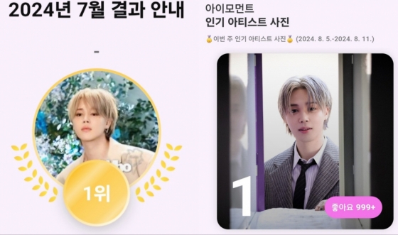 또한 지난주(8월 5일~ 8월 11일) '아이모먼트(iMoment)'에 지민의 사진이 1000개가 넘는 하트를 얻으며 1위에 올랐다. '아이모먼트'는 매주 월요일부터 일요일까지 아티스트별로 일주일 동안 커뮤니티에 업로드된 게시물 가운데 '좋아요' 수가 가장 많은 사진을 앱 첫 화면에 특별 노출하는 투표로, 지민은 벌써 18주째 1위를 차지해 무적의 팬덤 화력을 과시했다.