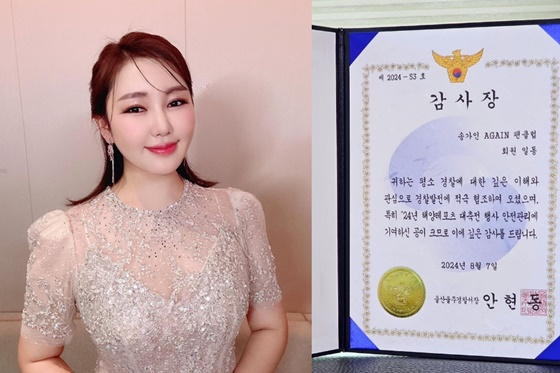 송가인은 17일 "감사장도 받은 어게인(팬덤명) 여러분들 자랑스럽고, 뿌듯하다"며 어게인이 울산울주경찰서로부터 받은 감사장을 공개했다.