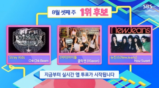 이날 스트레이 키즈는 지난달 발매한 새 미니앨범 'ATE' 타이틀곡 '칙칙붐(Chk Chk Boom)'으로 '인기가요' 1위 후보에 이름을 올렸다. 이어 (여자)아이들은 '클락션', 뉴진스는 '하우 스위트'로 '인기가요' 1위 후보가 됐다.