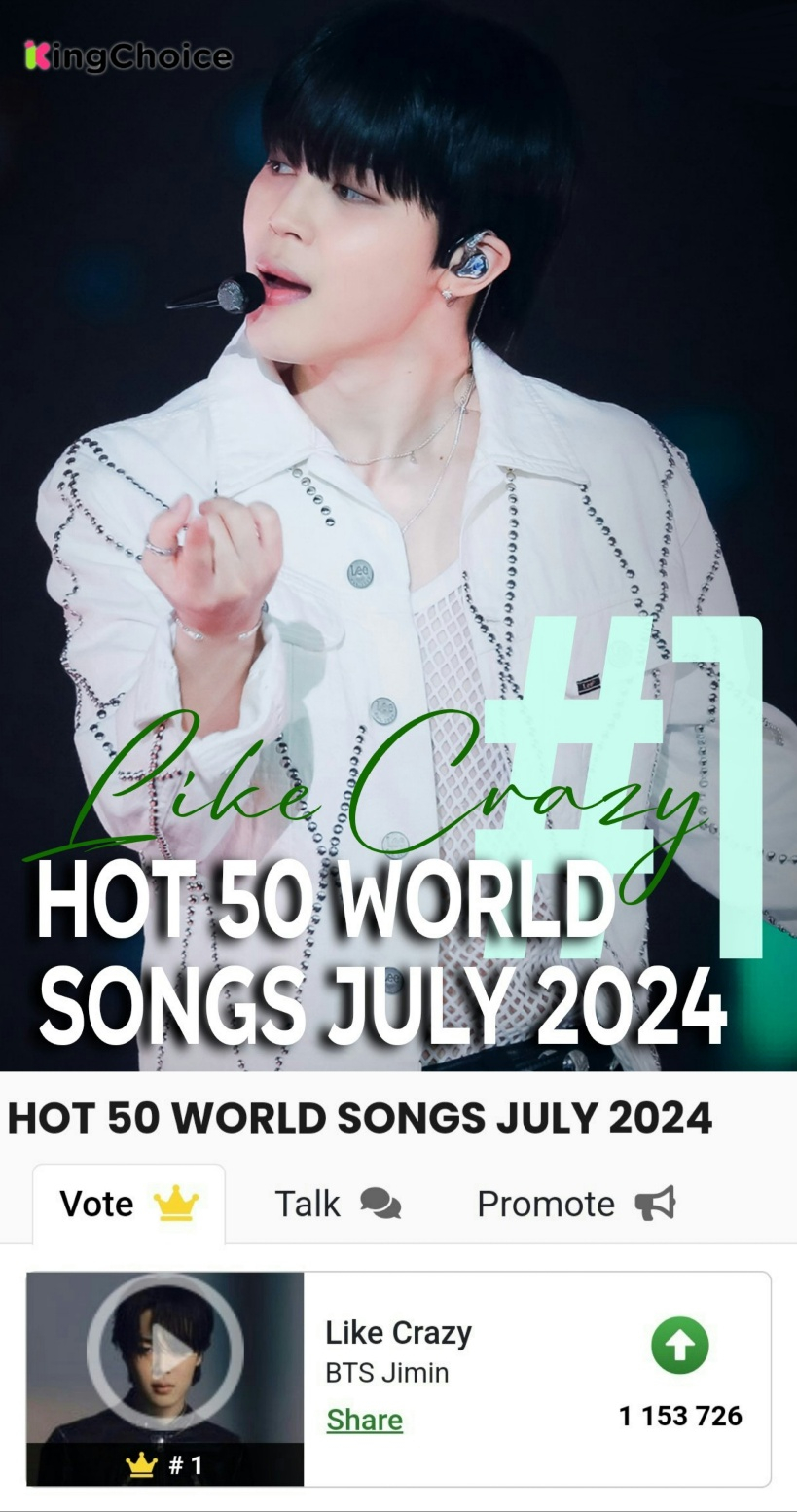 지민이 지난해 3월 발매한 첫 솔로 앨범 '페이스'(FACE) 타이틀곡 '라이크 크레이지'는 7월 16일부터 7월 31일까지 글로벌 K팝 투표 사이트 '킹초이스(King Choice)'에서 진행한 '2024년 7월 월드송 핫50(HOT 50 WORLD SONGS JULY 2024)' 투표에서 1위를 차지했다.