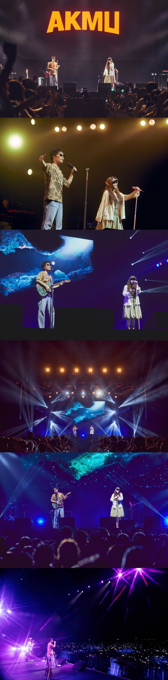 '전쟁터'로 오프닝을 연 AKMU는 관객들을 환상적인 하모니로 초대했다. 이어 'DINOSAUR' '어떻게 이별까지 사랑하겠어, 널 사랑하는 거지' 'Give Love' '오랜 날 오랜 밤' 등 밴드 버전으로 새롭게 편곡된 강렬한 첫 곡부터 한낮의 열기를 시켜주는 서정적인 발라드까지 고품격 라이브를 선사했다. 챌린지 열풍을 일으키며 글로벌 사랑을 받았던 'Love Lee'를 부를 때는 분위기가 절정을 향했다.