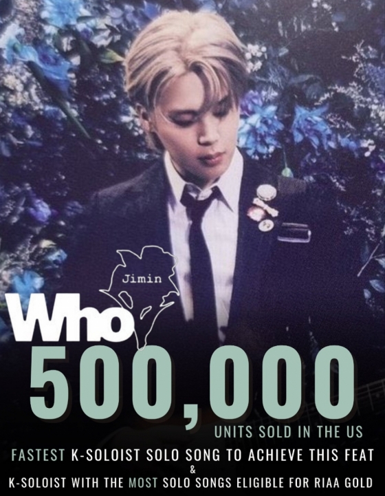 지민의 두번째 앨범 'MUSE'(뮤즈) 타이틀곡 'Who'(후)는 발매 29일만에 미국에서 50만 유닛 이상의 판매고를 올리며 미국 레코드산업협회(RIAA, Recording Industry Association of America)로부터 골드 인증 자격을 획득했다.