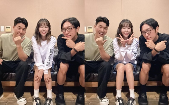 신지는 22일 오후 공식 SNS 채널을 통해 사진 두 장을 공개, 김종민, 빽가와 근황을 알렸다.