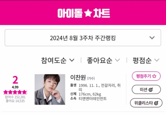 이찬원은 8월 3주 차 아이돌차트 평점랭킹에서 15만 2381표를 획득, 전체 2위를 차지했다.