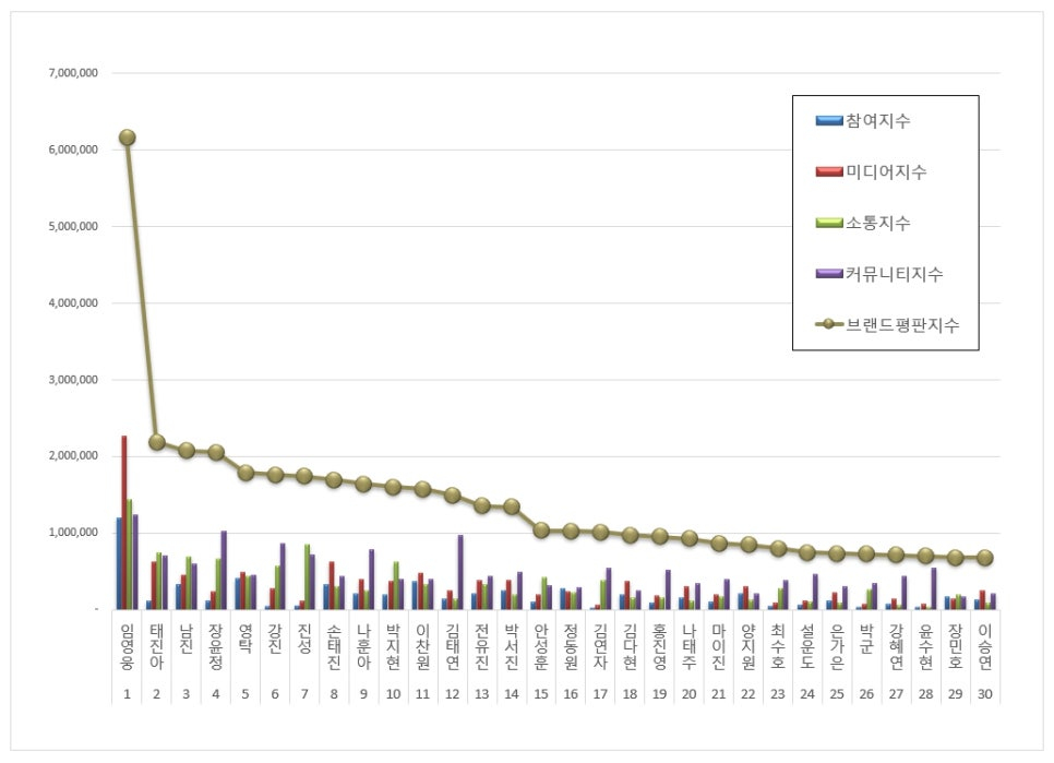 트로트 가수 브랜드평판 1위를 기록한 임영웅 브랜드는 참여지수 1,199,985 미디어지수 2,270,839 소통지수 1,444,346 커뮤니티지수 1,243,116이 되면서 브랜드평판지수 6,158,286으로 분석됐다.
