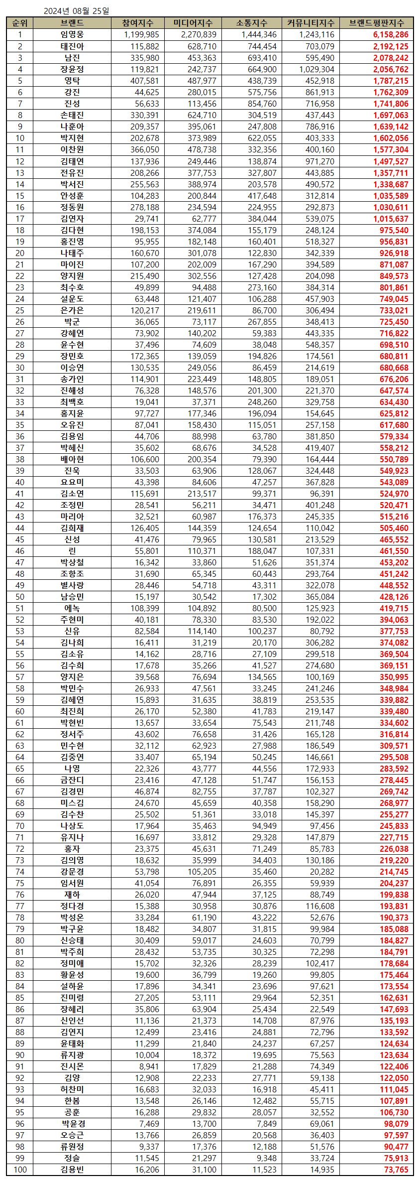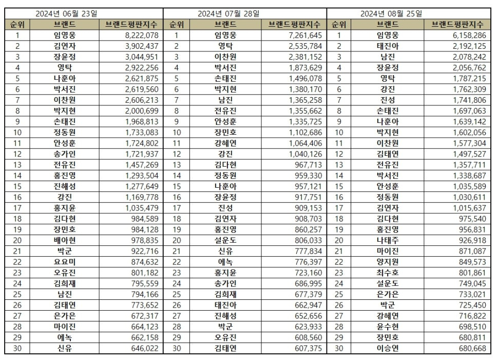 2024년 8월 트로트 가수 브랜드평판 30위 순위는 임영웅, 태진아, 남진, 장윤정, 영탁, 강진, 진성, 손태진, 나훈아, 박지현, 이찬원, 김태연, 전유진, 박서진, 안성훈, 정동원, 김연자, 김다현, 홍진영, 나태주, 마이진, 양지원, 최수호, 설운도, 은가은, 박군, 강혜연, 윤수현, 장민호, 이승연 순으로 분석됐다.