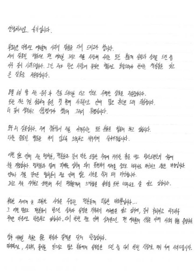 ◆ 방탄소년단 슈가 자필 사과문 전문