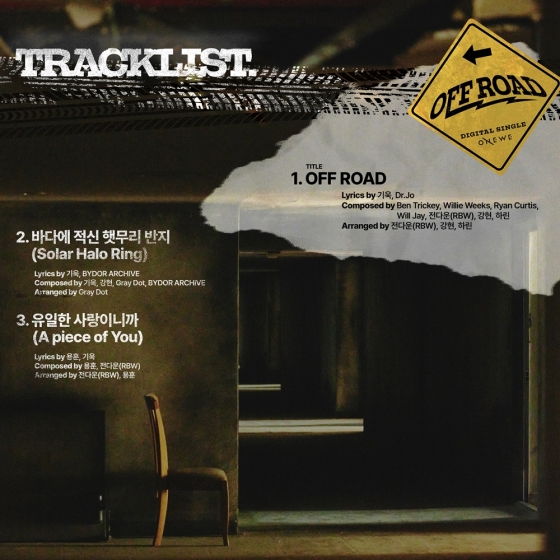 트랙리스트 이미지에는 공허한 폐건물에 의자 하나가 덩그러니 놓여진 가운데, 싱글명 'OFF ROAD'를 연상시키는 표지판과 거친 바퀴 자국, 모래가 흩뿌려진 듯한 폰트의 조화가 눈길을 끈다.