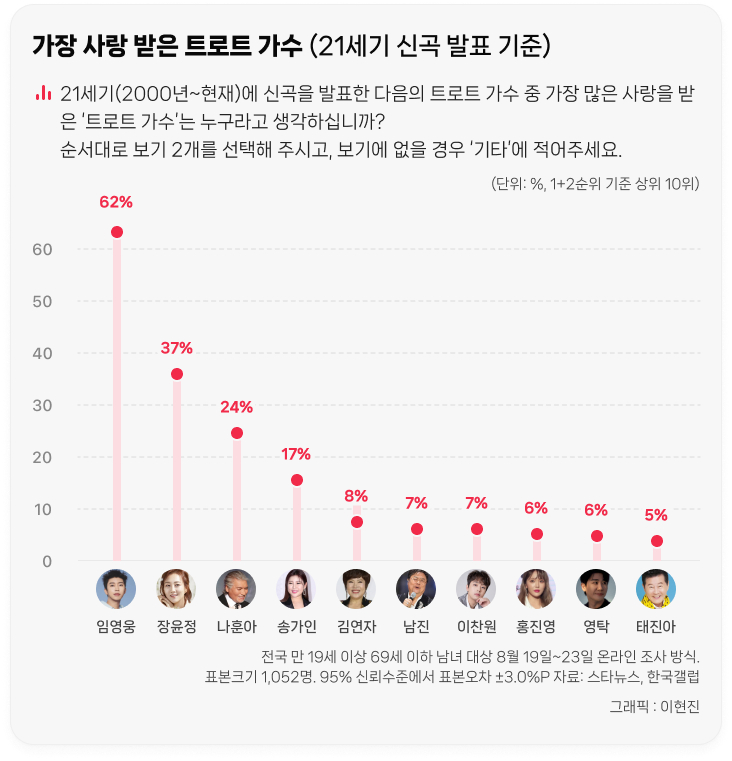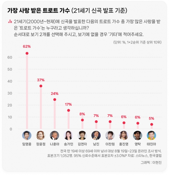 임영웅은 21세기 '최고 트로트 가수' 타이틀을 거머쥐었다. 임영웅은 '21세기 신곡 발표 기준, 가장 사랑받은 트로트 가수는 누구입니까?' 설문(2개 복수 응답)에서 62%의 득표율을 기록해 가장 많은 지지를 얻었다.