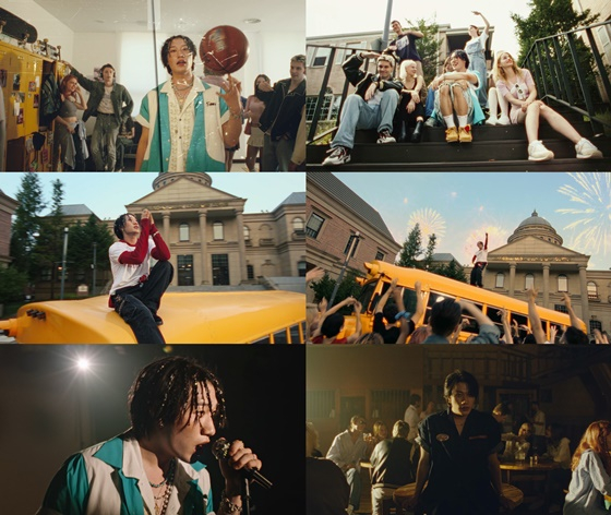 또한 수많은 학생들과 학교 밖으로 나온 그는 스쿨버스 위에 올라 스웨그 넘치는 안무를 선보인다. 학생들과 다함께 춤을 추는 장면에서도 '힙'한 매력을 대방출한다.