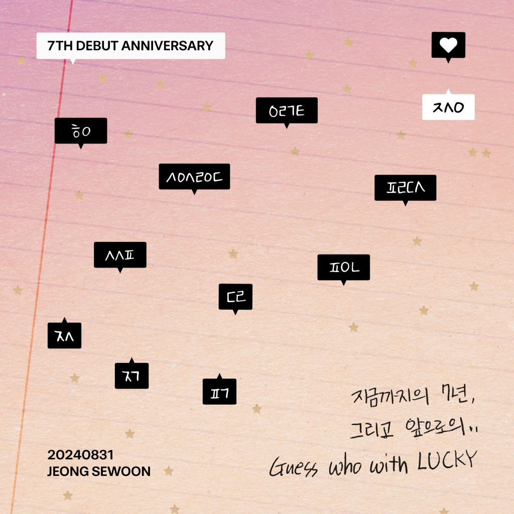 공개된 정세운의 7주년 축전 이미지에는 '지금까지의 7년, 그리고 앞으로의 Guess who with LUCKY'라는 문구가 적혀있어 팬들을 생각하는 마음을 엿볼 수 있다. 그리고 정세운과 연결된 초성 단어 또한 앞으로 그의 행보에 대해 기대감을 자아냈다.