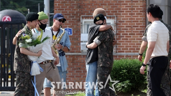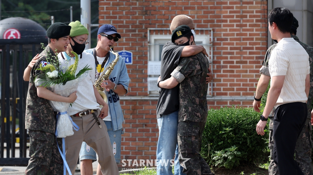 방탄소년단 멤버들은 지난 6월 12일에도 따로 휴가를 내고 맏형 진의 전역 현장을 찾아오며 감동을 선사한 바 있다.