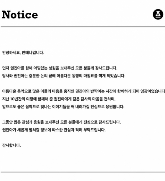 안테나는 5일 "권진아와 충분한 논의 끝에 아름다운 동행의 마침표를 찍게 됐다"라고 밝혔다.