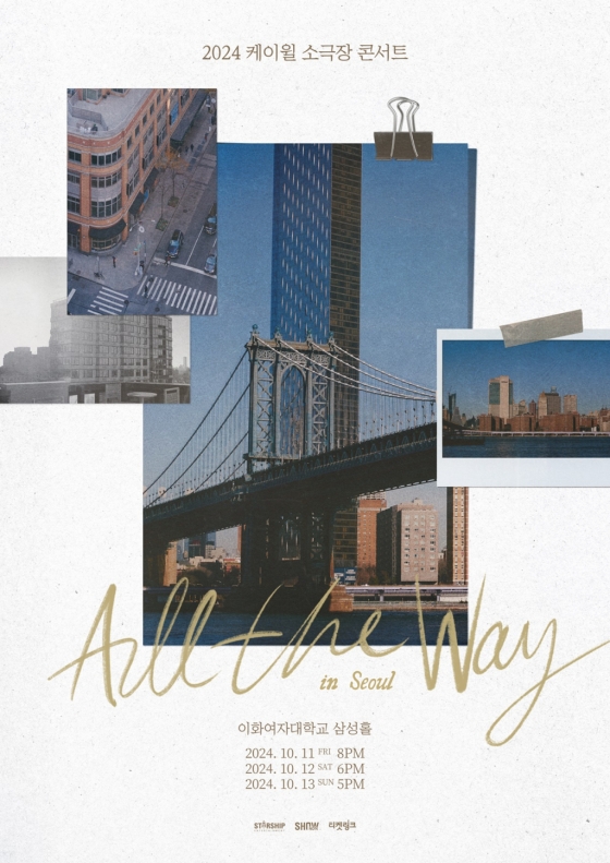 소속사 스타쉽엔터테인먼트에 따르면 케이윌은 오는 10월 11일부터 13일까지 3일 동안 이화여자대학교 삼성홀에서 '2024 소극장 콘서트 '올 더 웨이(All The Way)'를 개최한다.